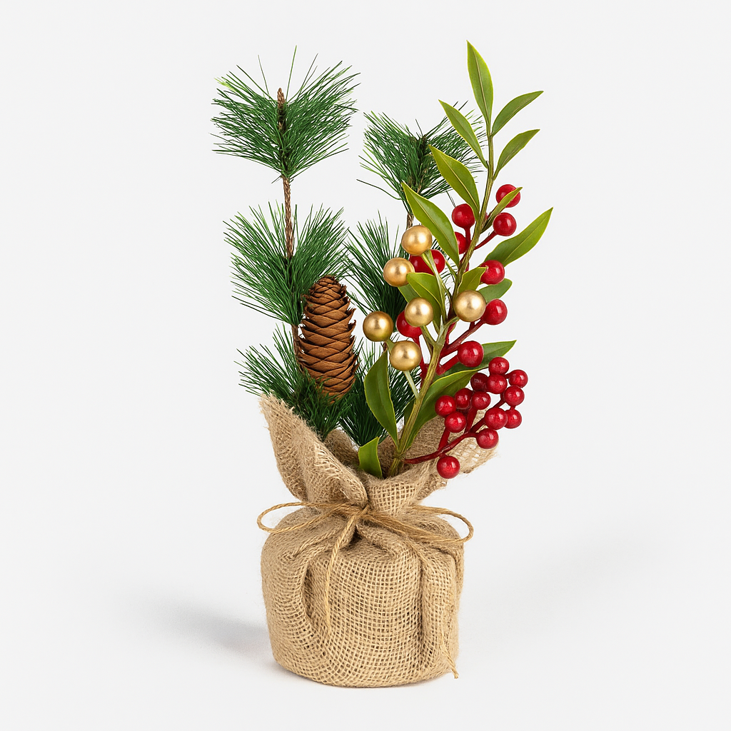 Arranjo natalino compacto, composto por folhagens verdes, frutos vermelhos, esferas douradas e pinha decorativa. A base em juta natural, amarrada com cordão rústico, traz um toque artesanal que combina perfeitamente com a decoração de fim de ano. Ideal para mesas, balcões, recepções e ambientes que pedem charme sem ocupar muito espaço. Uma peça versátil, durável e elegante para deixar qualquer cenário com clima natalino imediato.