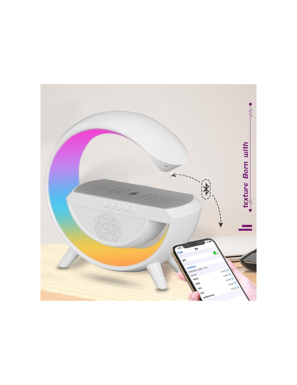 Candeeiro LED com Carregamento Wireless e Coluna BluetoothEste elegante candeeiro LED combina tecnologia moderna com funcionalidade prática. Além de iluminar o seu espaço com luzes RGB vibrantes, oferece carregamento sem fios e uma coluna Bluetooth integrada para uma experiência completa e eficiente.Características PrincipaisDesign Moderno: Candeeiro em formato semicircular com acabamento premium, ideal para decoração contemporânea.Luzes RGB: Efeitos luminosos coloridos e ajustáveis para criar o ambiente perfeito.Carregamento Wireless: Compatível com smartphones que suportam carregamento Qi, garantindo praticidade e eficiência.Coluna Bluetooth Integrada: Som de alta qualidade com conectividade fácil ao seu dispositivo.Controlo Simples: Botões intuitivos para ajustar as luzes, volume e reprodução de música.Especificações TécnicasAlimentação: USB-CPotência de carregamento: 10WBluetooth: Versão 5.0Distância de transmissão: Até 10 metrosLuz LED: RGB multicolor, ajustávelMaterial: ABS + PCDimensões: 20 cm x 15 cm x 8 cm